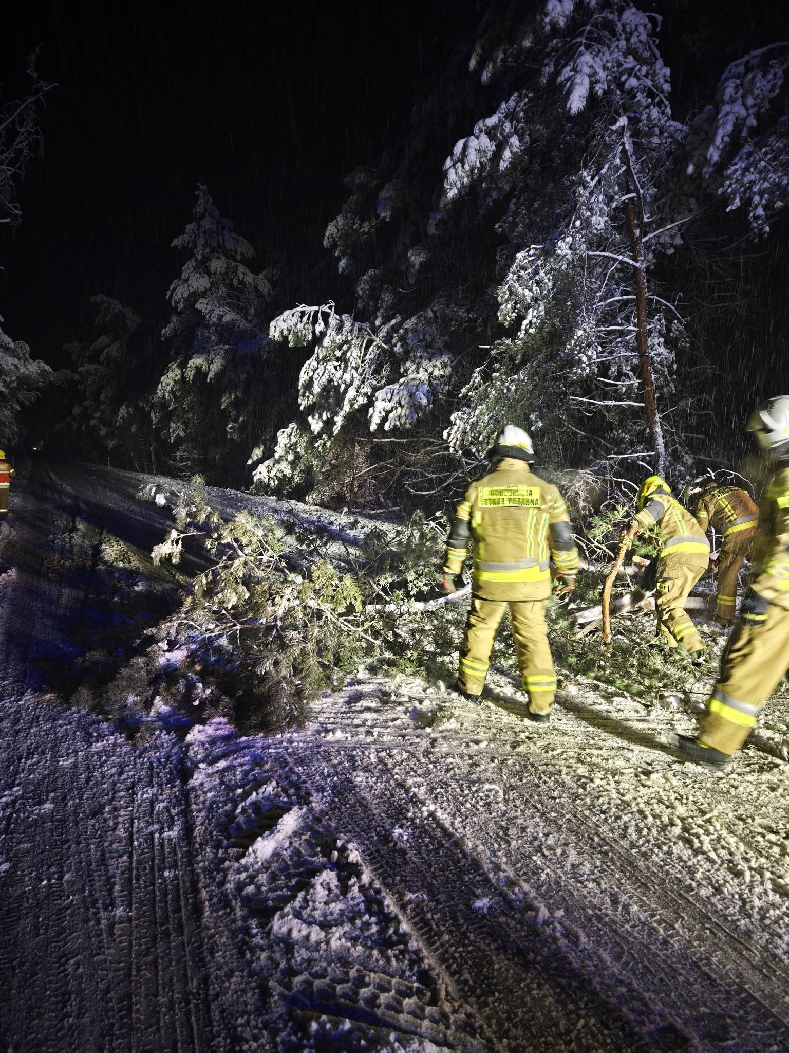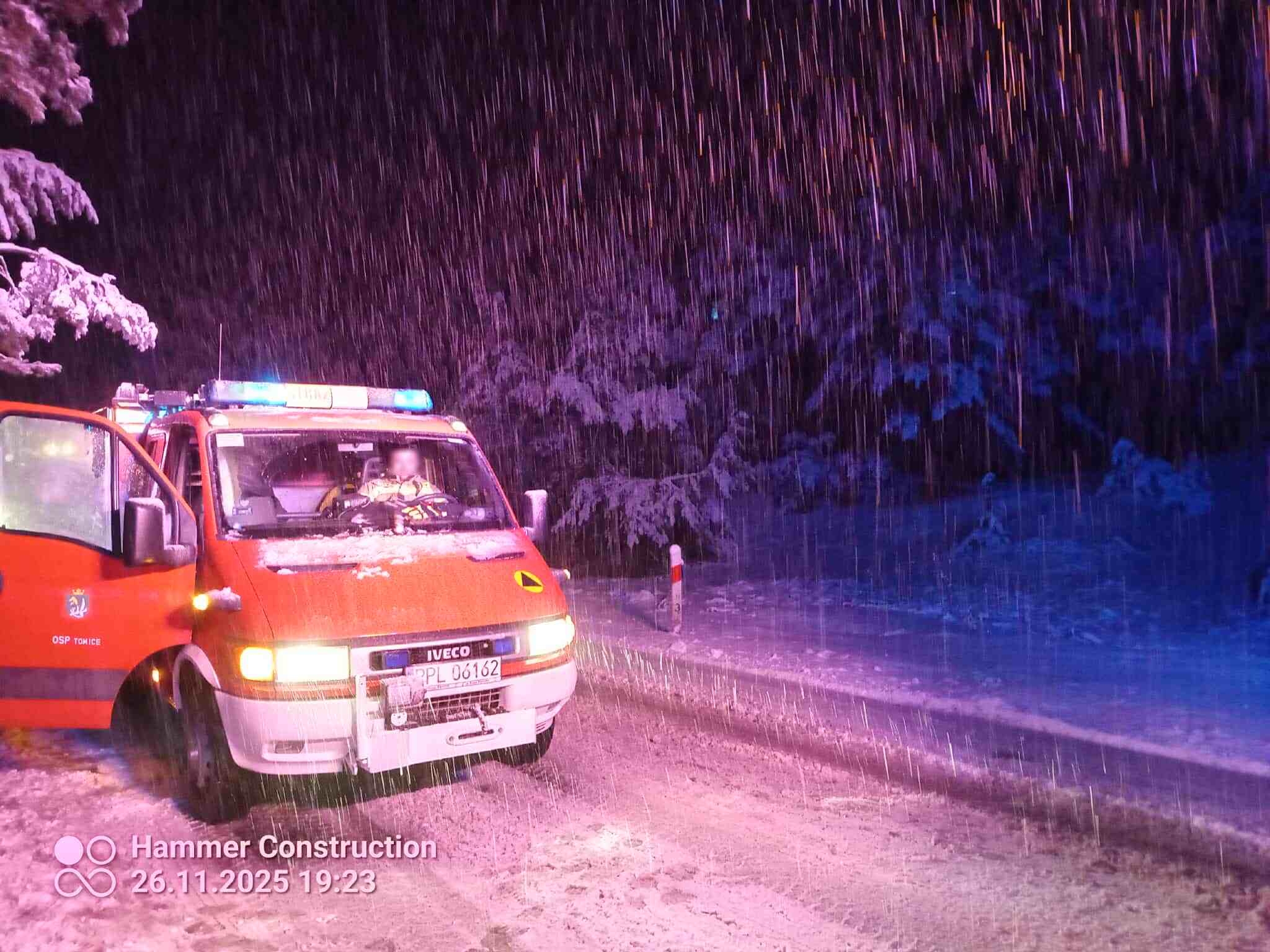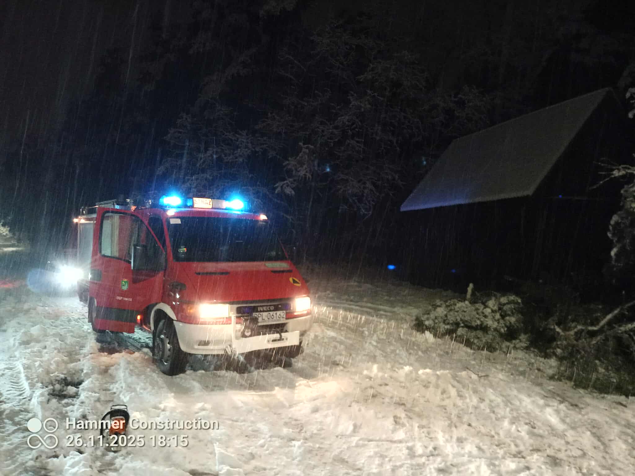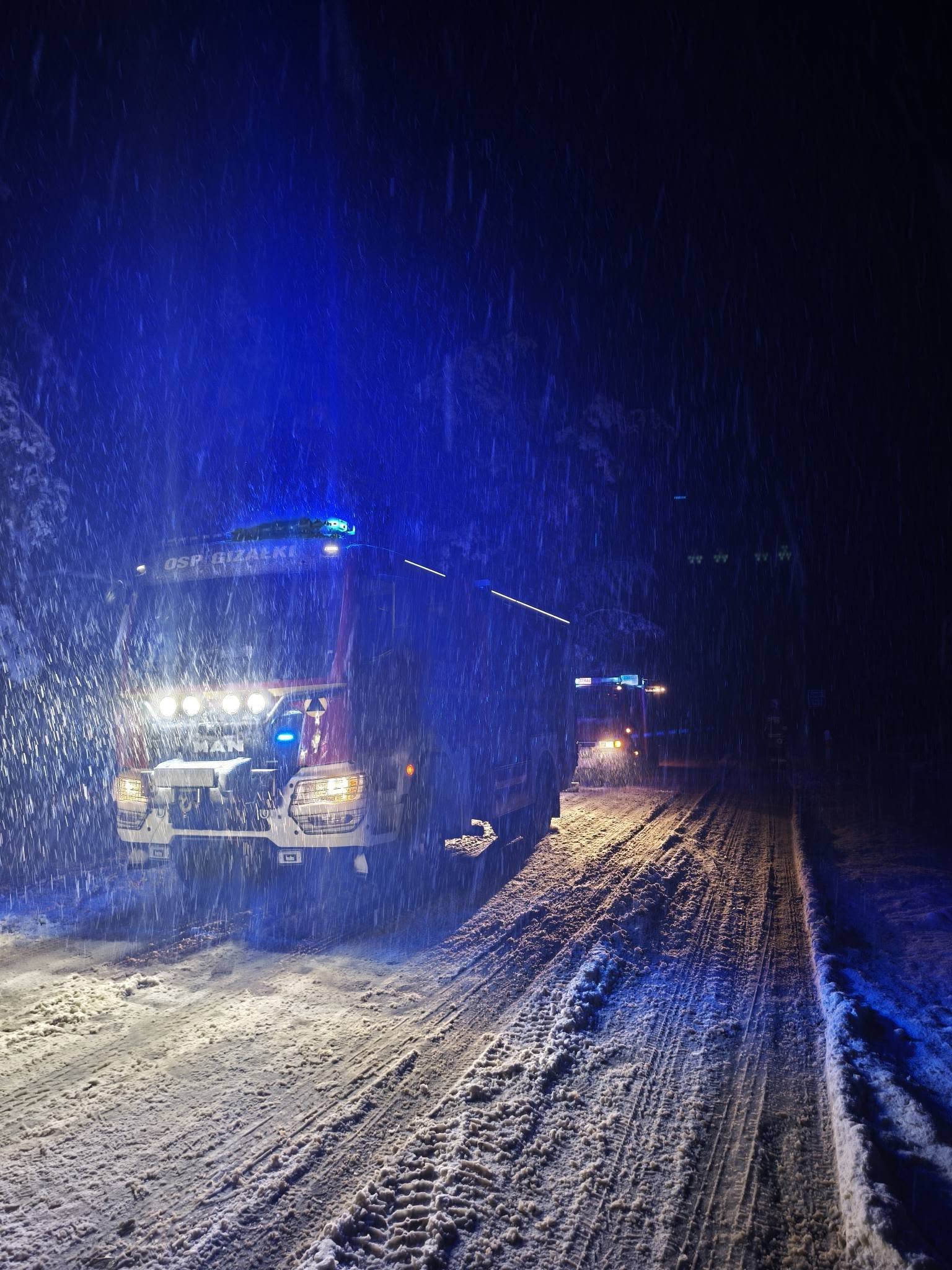 Opady śniegu utrzymywały się do późnych godzin nocnych, dlatego strażacy z jednostek OSP w całej gminie pozostają w gotowości do kolejnych interwencji. Podobne warunki panują także w gminach sąsiednich. Apelujemy do kierowców i pieszych o szczególną ostrożność: mokry śnieg wciąż obciąża drzewa, co może powodować kolejne złamania gałęzi i upadki drzew na jezdnię, a nawierzchnie dróg są bardzo śliskie. Zachowajcie rozwagę, zmniejszcie prędkość i zwracajcie uwagę na odcinki przebiegające w pobliżu zadrzewień.